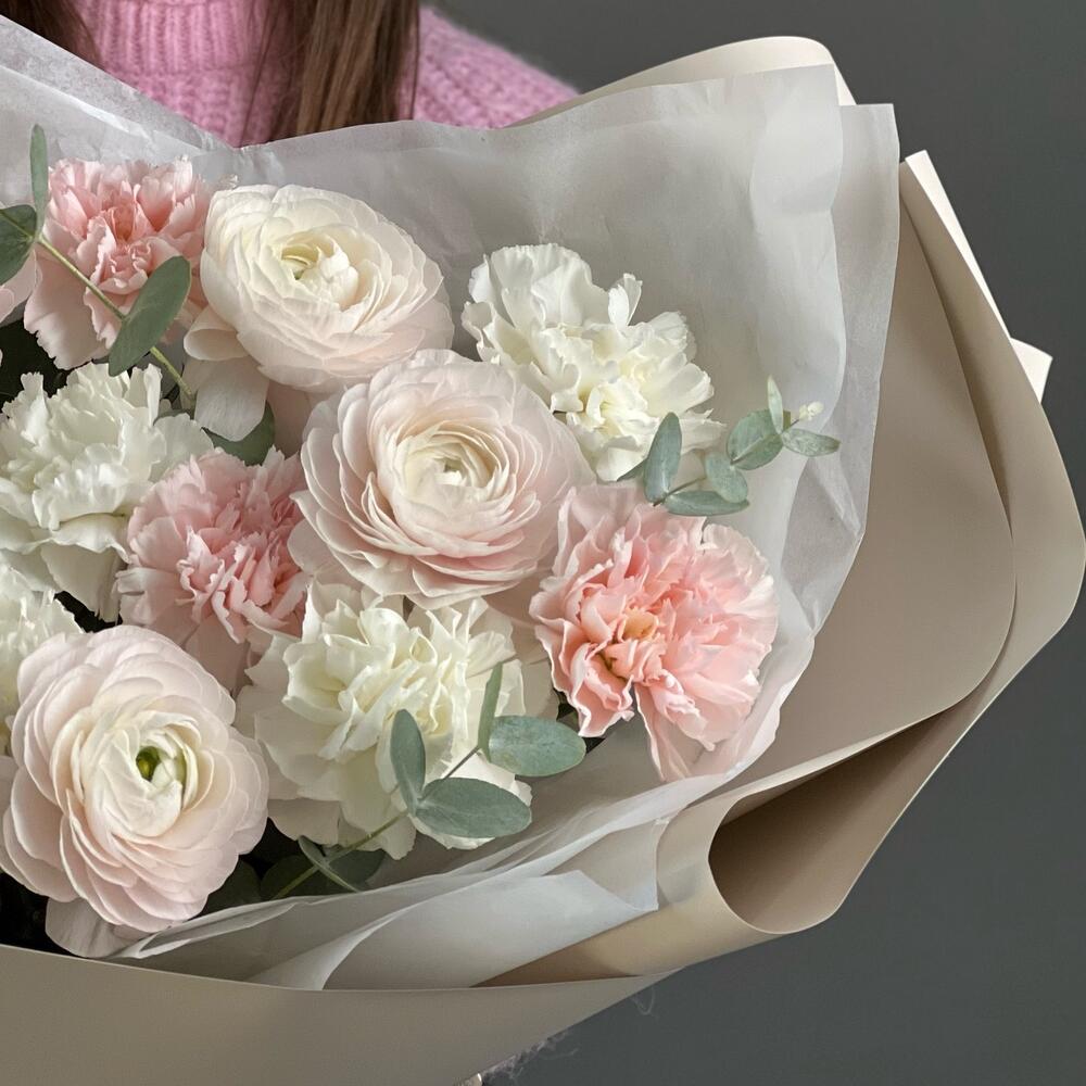 Невероятно нежный букет с воздушными ранункулюсами и стильными диантусами😍