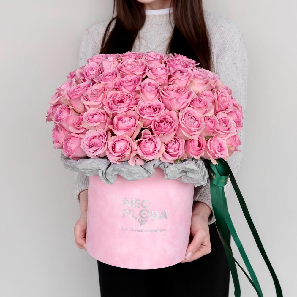 Роза - 101 шт. Лента атласная - 2 шт. губка флористическая с водой - 1 шт. коробка шляпная бархат - 1 шт.